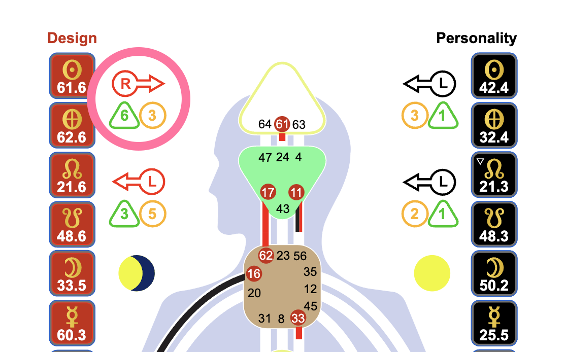 63 IS THE GATE. Gates are those numbers on the Energy Centers. Like Gate 63 in the Head Centre. There are 64 possible Gates. In this example, we’re looking at Gate 63.