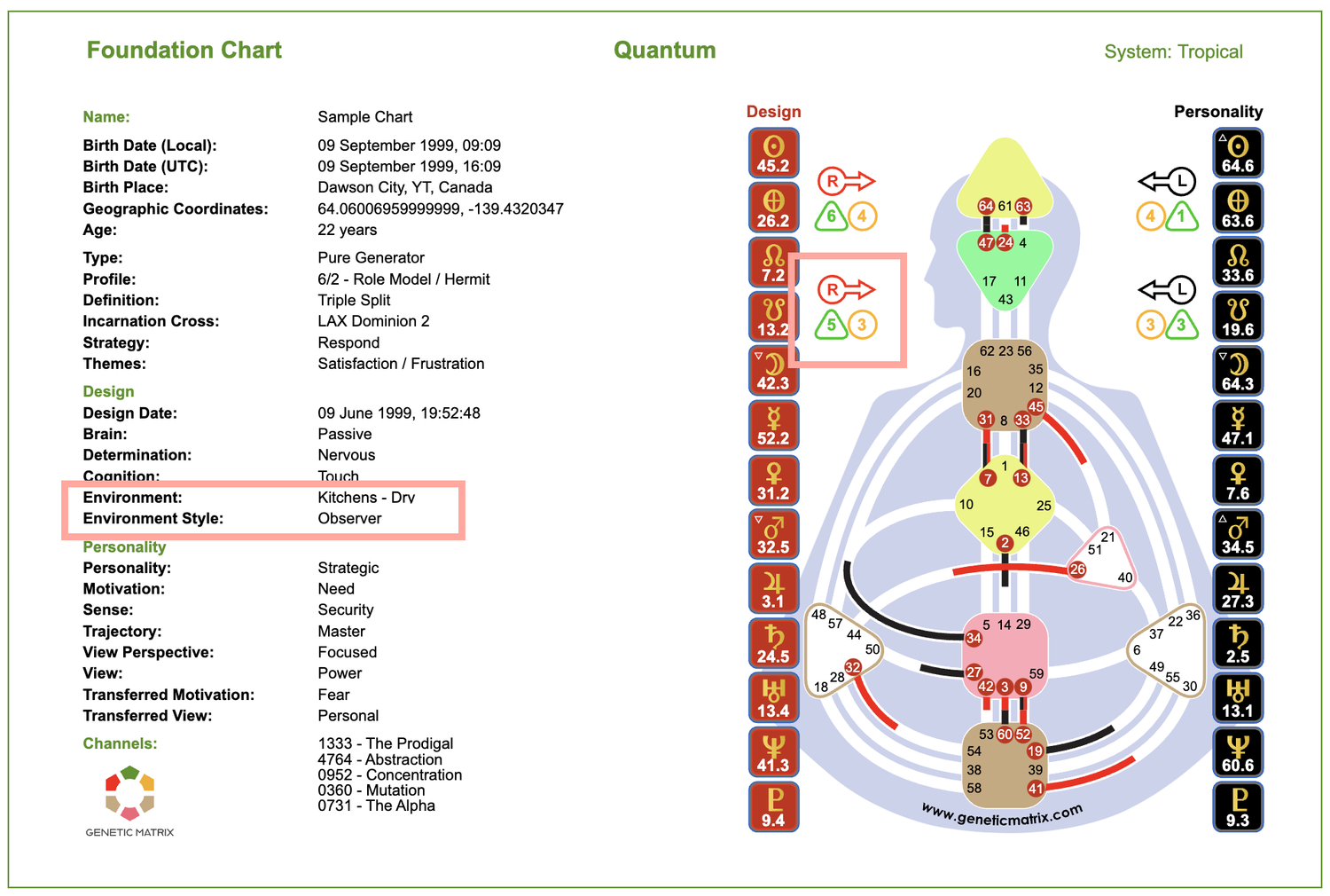 Here’s a visual of the Environment information we’re looking for. All you need is your birth data, including your date of birth, birth location, and exact birth time (to the minute!), and a Human Design Bodygraph calculator, like the one linked below. You can calculate a free chart with all the right data. You can also try my Variable exclusive calculator at thehumandesignvariables.com.