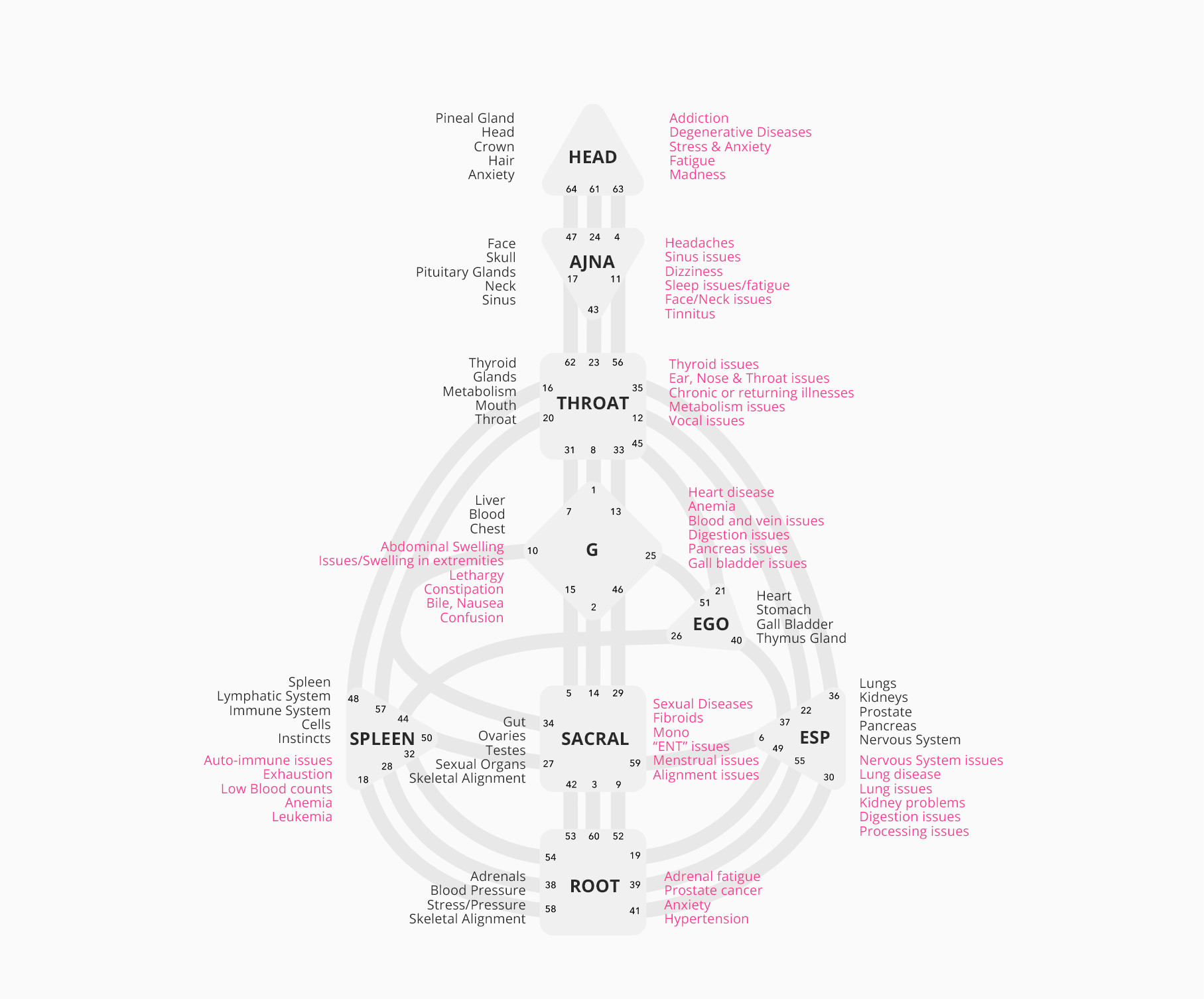 Metaphysical ailmentsWhen something is missing from a person’s life or if there is something there that isn’t in alignment with them, ailments and disease can show up in that Energy Center’s unhealthy state. Undefined and Open Centers are more vulnerable, although Defined Centers are not excluded from maladies. The following information is experimental and intended for contemplation.